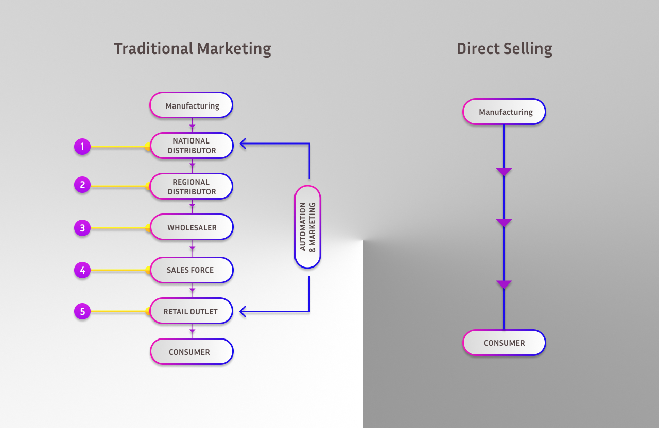In traditional marketing channels, up to 60% of a product's cost is spent on compensating various intermediaries, partners, and advertisements. Direct selling eliminates these channels, passing the savings to independent distributors.